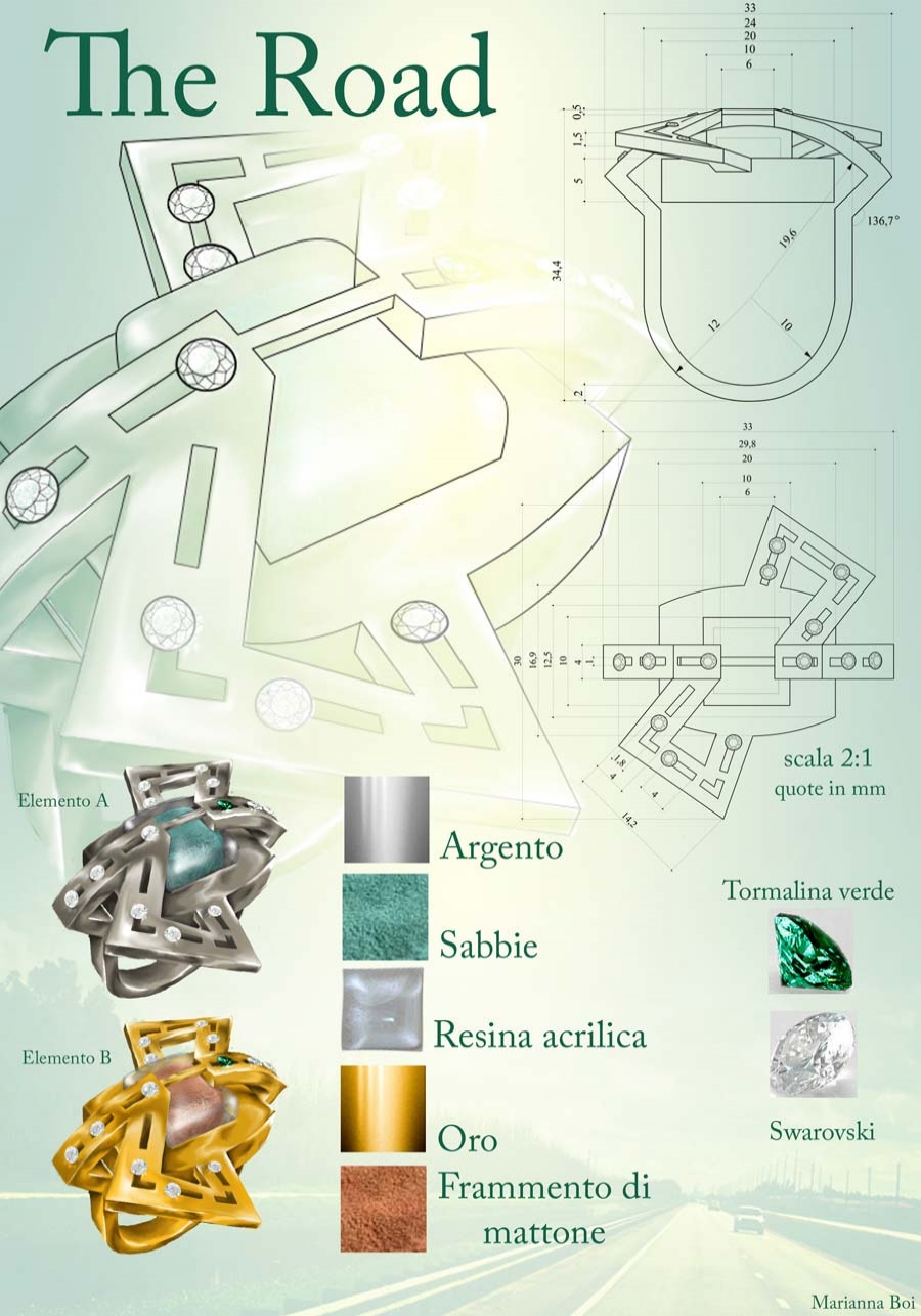 L'anello e' ispirato al percorso che le automobili seguono per giungere alla meta. La lettura del movimento e' esclusivamente visiva; la linea della strada accentua il movimento insieme alla posizione sparsa degli Swarovski. Questi ultimi sembrano "viaggiare" come veicoli sfreccianti sulla strada. Il rimando all'ambiente urbano e' dato dall'uso delle sabbie e del mattone.