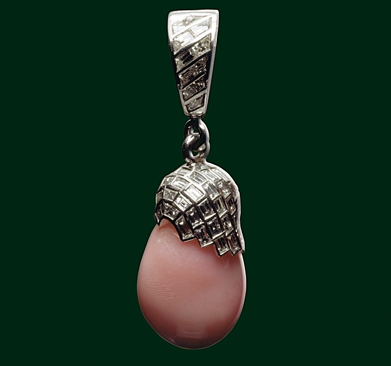 Avete mai visto una perla col caschetto? La fantasia del maestro arriva anche a questo: ma qui, più che fungere da protezione, il caschetto di diamanti rende la perla rosa ancora più preziosa.